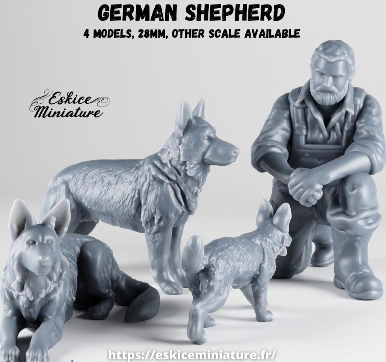 Resin Printed Miniatures- German sheperd with farmer (8 Pack)