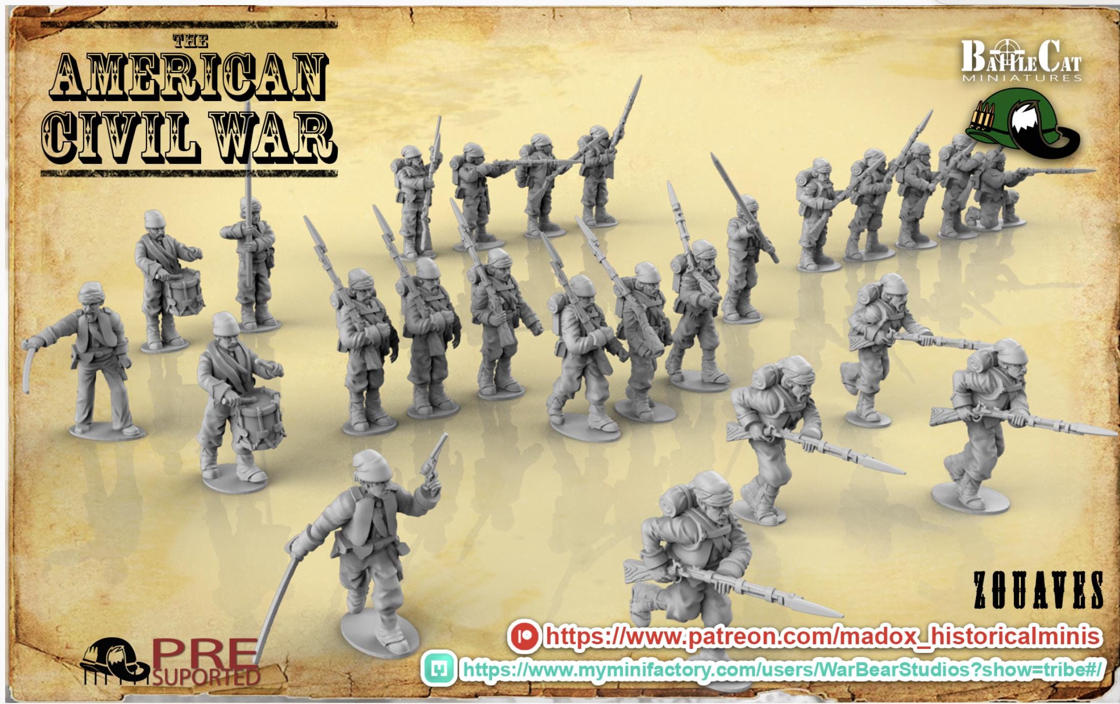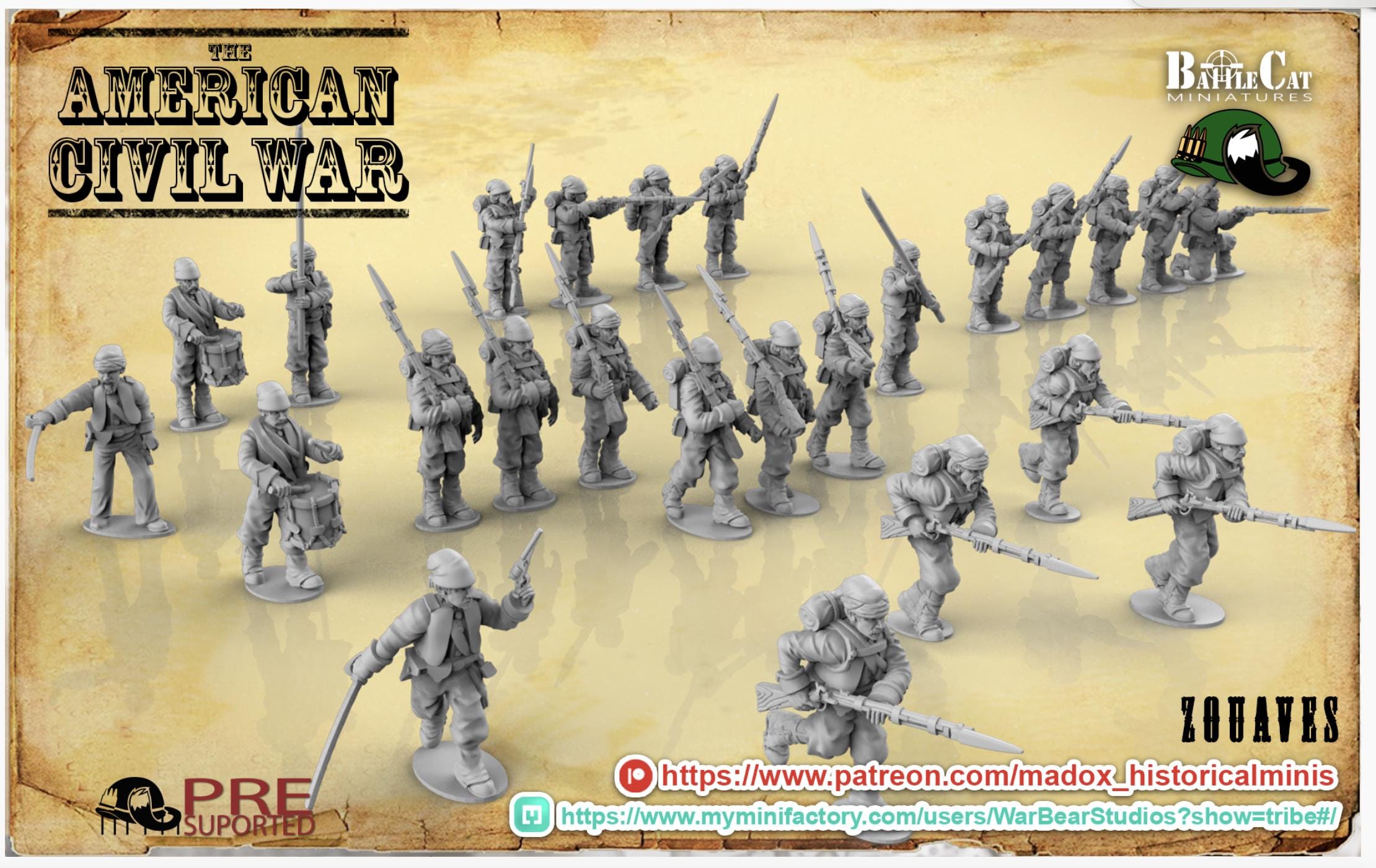 28mm American Civil Way Gaming- Resin Printed Figures- ACW Union Zouaves (Squad of 20 Including Command)