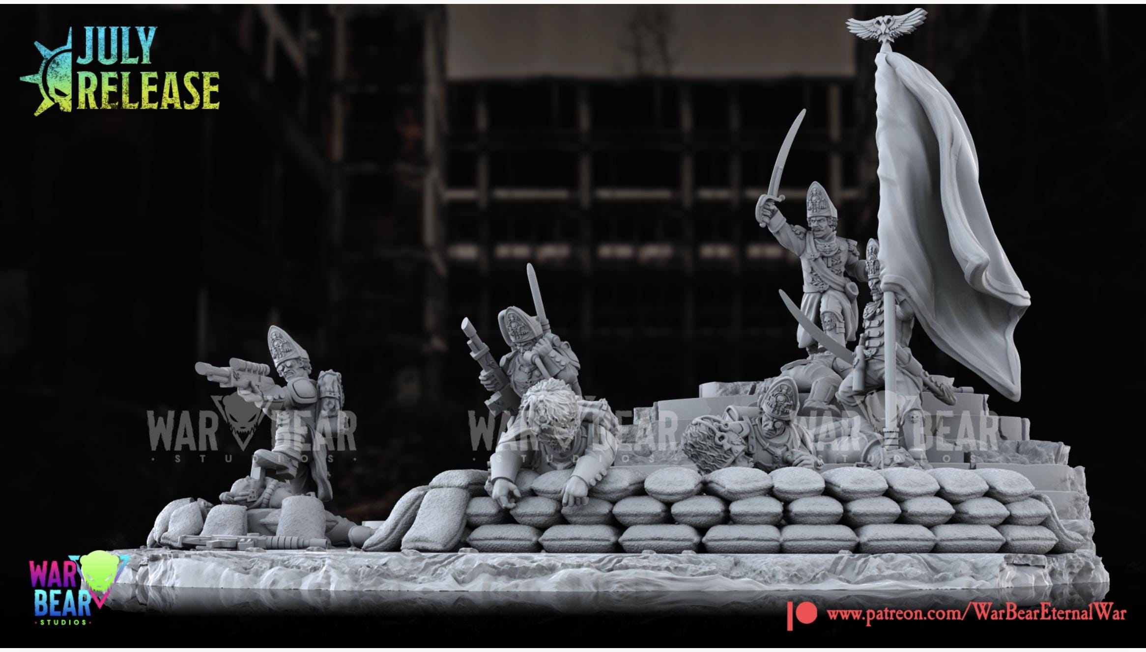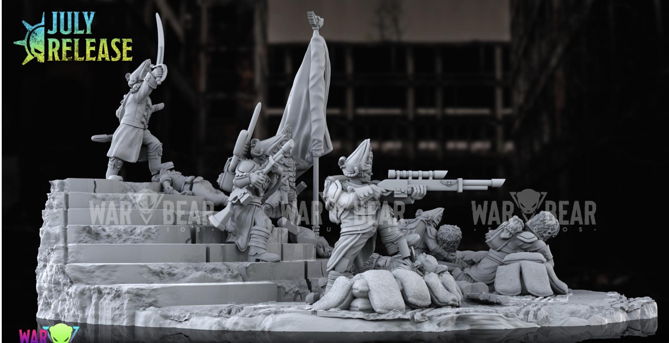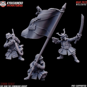 This set includes 5 miniatures, an officer, and ensign, a medic, a comms operator and a sniper. They come with multiple heads and a diorama like base for display.